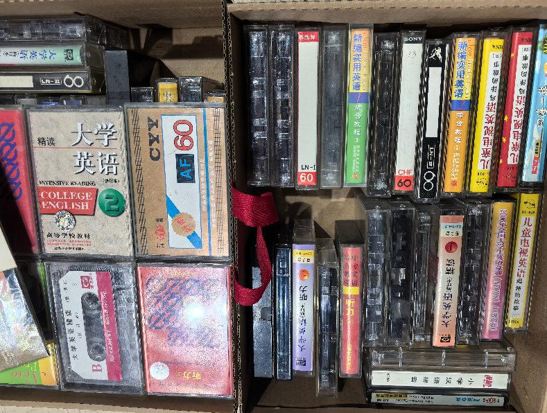 此次捐赠的磁带涵盖多类题材,既有英语学习系列,包括第一册、第二册的听力、阅读、朗读磁带,也有 BOOK 系列、DATE 系列专用磁带,还有《王魁与桂英打神》传统题材磁带及 SONY、CASINO、PARROT 等品牌磁带。所有磁带均为塑料质地,具有一定的时代印记和收藏价值。