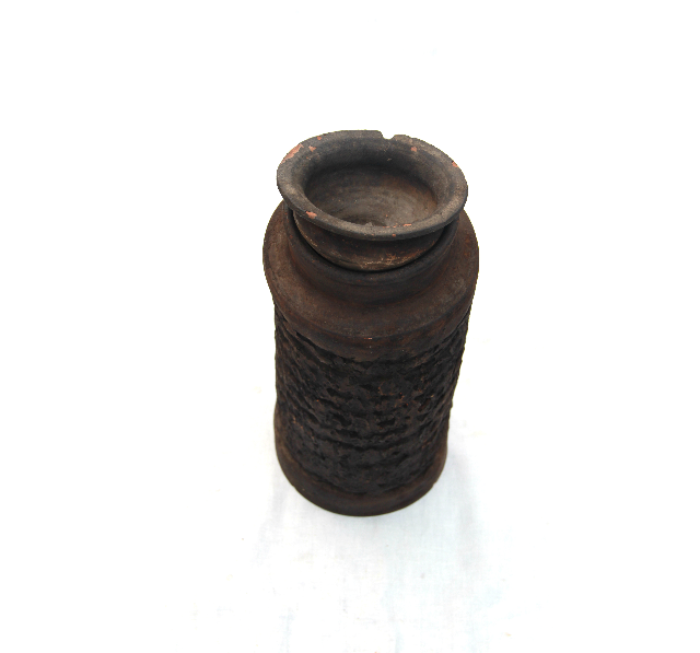 为民间实用的便携陶炭炉,器身呈筒状且带纹理,口沿外翻,是旧时取暖、煮茶的常用器具,尽显民间陶艺的质朴实用。