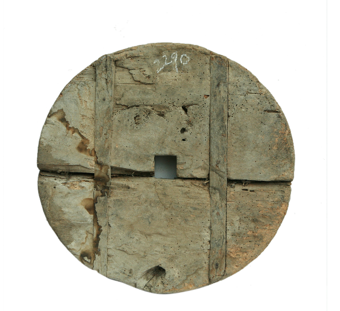 为鸡公车的核心木质构件,由实木拼接成轮盘,中心设轴孔,轮面留磨损痕迹,是旧时民间短途运输的经典器具部件。